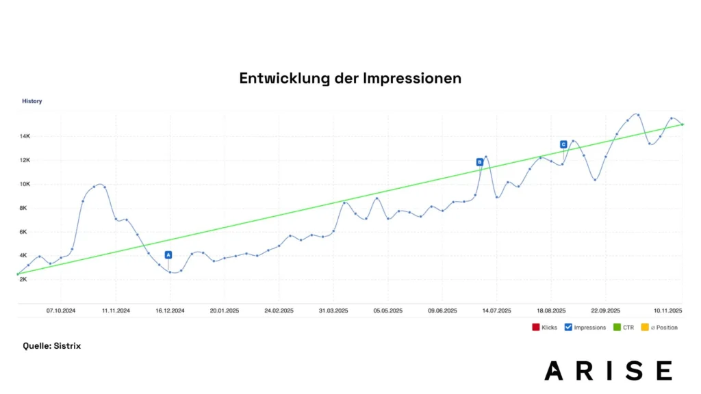 - Stabile Entwicklung ohne Einbrüche, Zeichen für nachhaltige SEO-Wirkung