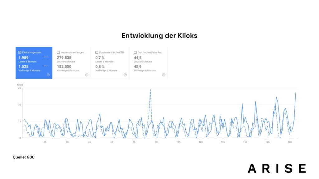 Die Klickentwicklung zeigt einen klaren, positiven Trend über den gesamten Betrachtungszeitraum. Mit 1.989 Klicks in den letzten sechs Monaten im Vergleich zu 1.525 Klicks im vorherigen Zeitraum steigert Soilkind seine organische Performance um rund 30 %. Die kontinuierliche Zunahme der täglichen Klicks – sichtbar durch die dichtere und höhere Ausschlagverteilung im Zeitverlauf – bestätigt, dass die umgesetzten SEO-Maßnahmen nachhaltig wirken. Besonders die optimierte Content-Struktur und die verbesserte Keyword-Ausrichtung führen zu einer konstant steigenden Sichtbarkeit, die sich direkt in mehr qualifizierten Suchanfragen und Website-Zugriffen widerspiegelt.