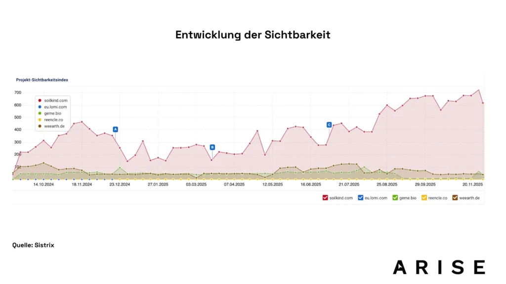 Die Entwicklung der Fokus-Suchbegriffe zeigt deutlich, wie Soilkind innerhalb weniger Monate eine starke und stabile organische Sichtbarkeit im direkten Wettbewerbsumfeld aufgebaut hat. Während vergleichbare Anbieter wie Lomi, Reencle oder Weeart nur minimale Sichtbarkeitsbewegungen verzeichnen, konnte Soilkind durch die Kombination aus technischer Optimierung, klarer Keyword-Fokussierung und zielgerichteter Content-Strategie ein kontinuierliches Wachstum erzielen. Besonders nach Umsetzung zentraler SEO-Maßnahmen (A–C) ist ein signifikanter Sichtbarkeitsschub erkennbar, der Soilkind im Marktvergleich klar an die Spitze setzt.
